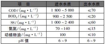 山西某肉類加工廠主營畜禽屠宰加工和熟肉生產加工業務,廢水主要來自豬、雞、鴨等畜禽屠宰車間、分割肉加工車間、肉制品加工車間和圈舍等。廢水中主要含有血液、油脂、碎肉、畜毛和糞便等污染物,屬高濃度有機廢水。該廢水呈褐紅色,具有較濃的腥臭味。廢水排放量為2 000 m3/d。設計出水水質要求同時達到《肉類加工工業水污染物排放標準》(GB 13457—92) 的一級排放標準及《污水綜合排放標準》(GB 8978—1996) 的一級排放標準,處理難度較大。