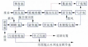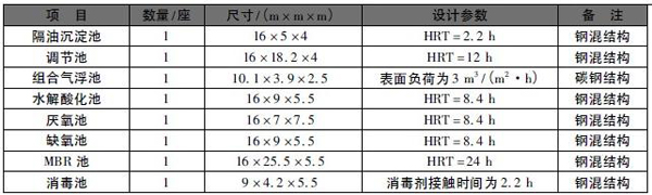 生化系統采用A2/O + MBR 組合工藝。A2/O工藝去除氨氮的效果已經得到廣泛認可,具有去除率高、運行穩定、成本低的特點。MBR 集膜的高效分離和生物降解于一體,是將污水生物處理技術與膜分離技術相結合的新型污水處理工藝。采用膜組件代替傳統活性污泥工藝中的二沉池,可進行高效固液分離,克服了傳統工藝中出水水質欠穩定、污泥易膨脹等不足。生物反應器內保持較高的污泥濃度,硝化能力強,污染物去除率高,部分混合液回流至缺氧池進行反硝化去除氨氮。MBR 池出水進入消毒池進行消毒后,可達標排放。