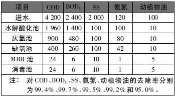 采用水解酸化-A2/O-MBR 工藝處理肉類加工廢水,處理規模為2 000 m3/d。工程運行結果表明,該工藝處理效率高,最終出水COD、BOD5、SS、氨氮、動植物油分別低于30、10、20、5、10 mg/L,同時達到《肉類加工工業水污染物排放標準》(GB13457—92) 一級標準和《污水綜合排放標準》(GB8978—1996) 一級標準,處理后的水質良好且穩定,可以直接回用。該工藝自動化程度高,操作簡單,管理方便,并適合在北方地區的冬季正常運行。