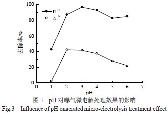 在鐵炭質量為20 g、鐵炭質量比1:1、粒徑為篩孔0.83 mm、HRT 為30 min,充分曝氣的條件下,考察pH 對Pb2+、Zn2+ 去除率的影響,結果見圖3。