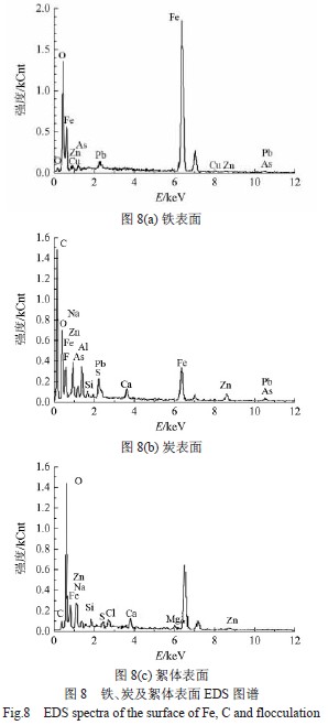 結合圖8 和表3 可看出,3 種物質反應后表面成分復雜,鐵表面除Fe、O、C 元素含量較高外,還有質量分數分別為10.5%的Pb 和1.67%的Cu 等;活性炭表面除含Fe、O、C 元素外,還有質量分數為10.61%的Pb 等;絮凝絮體表面除含Fe、O、C 元素外,Zn、Na元素居多,質量分數分別達到3.26%和10.10%,此外還有少量Cd、Mg 等,但未發現Pb、Cu 或未檢測出。證明Pb、Cu 離子主要是鐵炭微電解法去除的,而Zn、Cd、F 等離子和總As 主要是被后處理絮凝部分去除,這與前面的試驗研究結果(表2)一致。具體參見http://www.bnynw.com更多相關技術文檔。