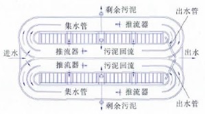 水解酸化池采用專利技術—一體化環流厭氧水解池,該池型將水解酸化池和沉淀池合為一體,沉淀池底部設置排泥裝置,中部均勻設置一組斜管,頂部設置排水裝置,其特征在于: 反應池為環形,并通過中間墻分隔成內外兩層,沉淀池布置在反應池正中央,且兩者之間通過隔墻隔開,隔墻上對稱開設一組連通反應池和沉淀池的布水孔。該池體具有結構緊湊,占地省,能耗、造價和運行成本低等優點。水解酸化池共設2 組,單組設計規模為1×104m3 /d,2 組合建,具體形式見圖2。