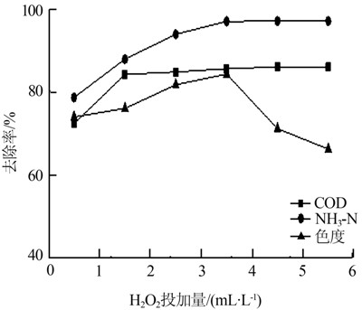 由圖 3可知,隨著H2O2投加量的增加,COD、NH3-N和色度去除率升高,當H2O2投加量增加到一定程度后,繼續增加H2O2投加量,COD和NH3-N去除率的變化變得平緩,而色度去除率則有所下降。這可能是因為H2O2投加量較低時,增加H2O2投加量會使生成的·OH增加,從而使COD、NH3-N和色度去除率迅速升高;而當H2O2投加量過大時,較高濃度的H2O2一方面會加劇其自身的分解反應,另一方面H2O2本身會消耗·OH,發生如式(2)的反應。此外,過大用量的H2O2還會將Fe2+氧化為Fe3+,從而使氧化過程按式(1)進行,導致大量的·OH消耗于Fe2+的催化氧化過程,而廢水中微溶的Fe3+由于其本身所具有的顏色特征,也會使色度有所上升。從處理效果與試劑的消耗成本等方面綜合考慮,選擇 H2O2投加量為3.5 mL/L較為適宜。