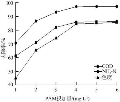 由圖 4可知,PAM投加量對焦化生化廢水的處理效果有一定的影響。隨著PAM投加量的增加,COD、NH3-N和色度去除率均升高,當PAM投加量﹥ 4.0 mg/L時,COD、NH3-N和色度去除率的升高幅度不大。從PAM的降解性、處理效果和試劑的消耗等方面綜合考慮,選擇PAM投加量為4.0 mg/L較為適宜。具體參見http://www.bnynw.com更多相關技術文檔。