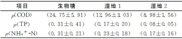 生物塘進水平均值為:ρ(COD)=(68.71±8.27)mg/L,ρ(TP)=(1.43±0.53)mg/L,ρ(NH4+-N)=(0.97±0.43)mg/L。污染濃度不是很高,但是如果直接排入黃沙河,還是會對其造成污染威脅。