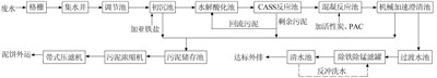采用初沉+水解酸化+CASS+混凝沉淀吸附+過濾組合工藝處理紡織工業印染廢水,調試運行結果表明,當進水COD、BOD5、SS分別為2 000、450、300 mg/L,色度為800倍時,出水COD、BOD5、SS分別為54、10、30 mg/L,色度為30倍,平均COD、BOD5、SS和色度去除率分別為97.3%、97.8%、90.0%和96.3%,出水水質穩定,達到《紡織染整工業水污染物排放標準》(GB 4287—2012)中新建企業水污染物排放限值的要求。