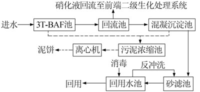 生化處理系統出水和己二酸酸性廢水的混合水首先進入3T-BAF池,3T-BAF池通過固定化高效微生物對廢水中難生化的大分子、難降解、有毒有害有機污染物和氨氮進行進一步降解。3T-BAF池出水經回流池一部分回流至前端生化處理系統缺氧池中進行反硝化脫氮,回流比控制在2∶1左右,一部分進入混凝沉淀池。在混凝沉淀池中投加PAC、PAM等混凝藥劑,與回流池出水進行混凝反應。經沉降后的廢水進入砂濾池,通過砂濾進一步去除廢水中的SS。砂濾池出水進入回用水池消毒后即可回用。3T-BAF池及混凝沉淀池污泥經污泥濃縮池后,進一步壓縮脫水制成泥餅。