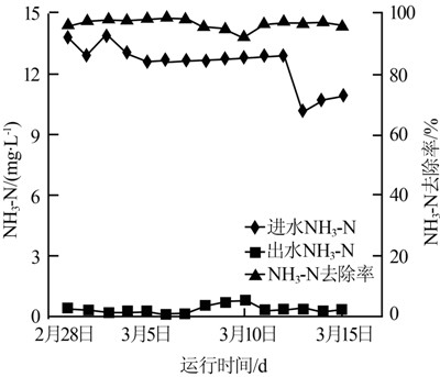 由圖 3可知,經深度處理后,出水NH3-N為0.17~0.89 mg/L,平均NH3-N去除率為96.8%,完全符合回用水水質NH3-N≤5 mg/L的要求。
