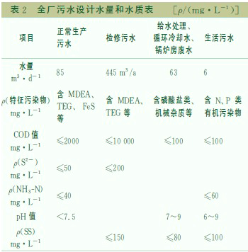 本工程污水中污染物主要有脫硫劑甲基乙二醇胺[CH3-N(CH2CH2OH)2](年耗量24t/a)、脫水劑三甘醇(C6H14O4)(年耗量17t/a)、硫磺回收無機催化劑、原料氣中分離的高礦化度地層水(SO42-、Cl-)、輕烴(≥C4)、硫化物(S2-)、各種分析化驗試劑、鍋爐和水處理系統(tǒng)藥劑。設計污水量和水質(zhì)見表2。