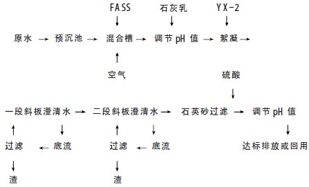 FASS 無機復合凈水劑與“高效多功能YX-2 型混凝劑”相結合共同使用的方式,能有效的將重金屬離子深度去除,同時又可克服因沉降槽的沉降箱行程短或流量大,沉降時間不夠,造成絮狀沉淀物翻起上浮的現象。
