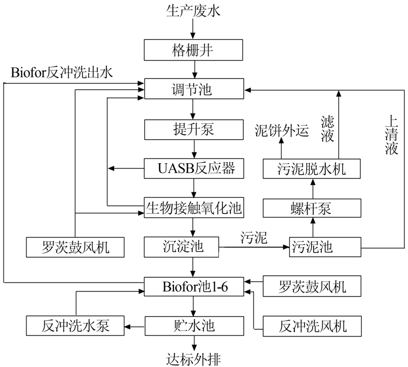江西某食品廠目前主要以生產異VC鈉食品添加劑為主,生產過程中產生濃度高、色度高及可生化性強的廢水。針對該公司廢水的特點,采用UASB—生物接觸氧化池—Biofor(一段式生物過濾氧化反應器)工藝處理廢水,要求達到《污水綜合排放標準》(GB 8978—1996)的一級標準,即pH為6~9,COD≤100 mg/L,色度≤50倍。