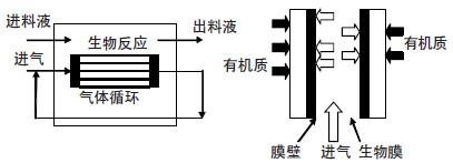 無泡曝氣生物反應器通過致密膜或者微孔膜向生物反應器進行無泡曝氣。氣體分壓低于泡點,并且氣體在膜系統中,提高了有機污水與膜的接觸時間,增加了傳氧效率。膜爆氣生物反應器見圖1。