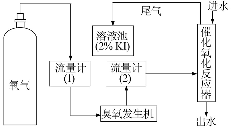 實(shí)驗(yàn)裝置見圖 1。催化臭氧化實(shí)驗(yàn)在D 50 mm×600 mm、有效容積700 mL的自制有機(jī)玻璃柱反應(yīng)器中進(jìn)行。臭氧由CFJ-5型臭氧發(fā)生機(jī)(成都市明日新城環(huán)保有限公司)現(xiàn)場制備,以氧氣(99.99%)為氣源。實(shí)驗(yàn)前先用自來水沖洗反應(yīng)器,再用去離子水清洗數(shù)次以去除反應(yīng)器中可能消耗臭氧的干擾組分。實(shí)驗(yàn)時(shí)將調(diào)整好pH的500 mL鉆井廢水一次性轉(zhuǎn)入反應(yīng)器中,連接好裝置,并檢查裝置氣密性。實(shí)驗(yàn)采用連續(xù)投加臭氧工藝,臭氧經(jīng)微孔曝氣頭進(jìn)入反應(yīng)器,臭氧和廢水在反應(yīng)器中混合,從而發(fā)生氣、液兩相反應(yīng),臭氧投加量由臭氧管路上的流量計(jì)精確計(jì)量,臭氧尾氣由2%KI溶液進(jìn)行吸收。待臭氧濃度穩(wěn)定后加入適量催化劑,同時(shí)開始實(shí)驗(yàn),定時(shí)(間隔10 min)取樣進(jìn)行分析,取樣前在燒杯中加入少量0.05 mol/L的硫代硫酸鈉溶液以終止廢水中剩余臭氧與有機(jī)物的氧化反應(yīng)。