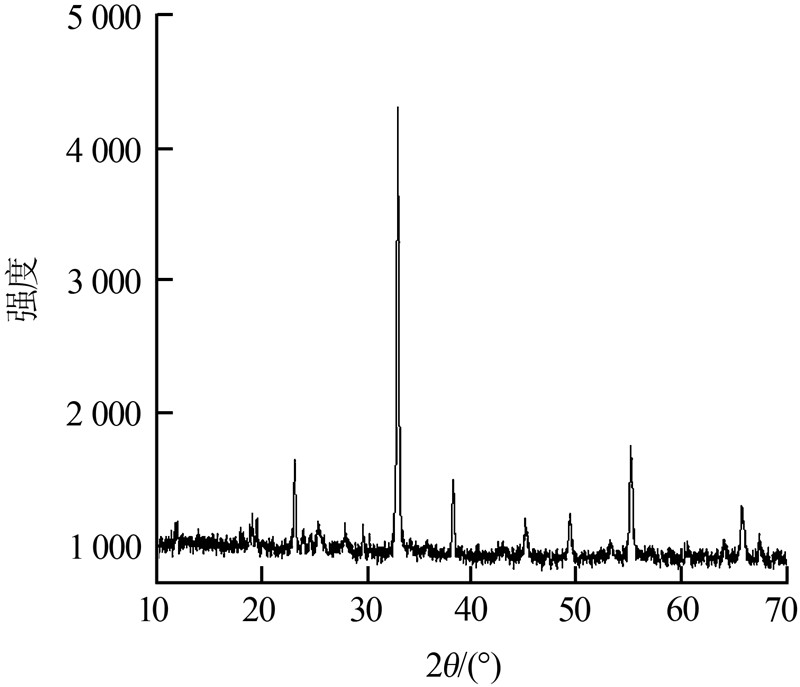 在臭氧投加量為80 mg/L、pH為11.5、催化劑投加量為20 g/L、反應(yīng)時(shí)間為40 min最佳工藝條件下,比較了單獨(dú)臭氧氧化、MnO2吸附和O3/MnO2催化氧化對鉆井廢水COD的去除效果,結(jié)果見圖 2。從圖 2可見,向反應(yīng)體系中加入20 g/L的MnO2,反應(yīng)40 min時(shí)COD去除率僅有2.3%,可見MnO2對廢水中有機(jī)物的吸附去除作用非常弱,相對于其他工藝幾乎可以忽略不計(jì)。單獨(dú)臭氧氧化去除COD的能力也比較微弱,氧化40 min后去除率僅達(dá)到48.13%。當(dāng)向單獨(dú)臭氧氧化體系中加入MnO2后,強(qiáng)化了對COD的去除能力,反應(yīng)40 min時(shí)COD去除率高達(dá)87.51%,幾乎是單獨(dú)臭氧氧化去除率的兩倍,出水COD從686.28 mg/L降至85.72 mg/L,達(dá)到了GB 8978—1996的一級標(biāo)準(zhǔn)。這說明MnO2的加入起到了催化作用,從MnO2的XRD譜圖(見圖 3)也可以發(fā)現(xiàn),MnO2的特征峰2θ為32.95°,且X射線衍射數(shù)據(jù)顯示MnO2具有很強(qiáng)的催化活性,其質(zhì)量分?jǐn)?shù)高達(dá)99.9%以上。