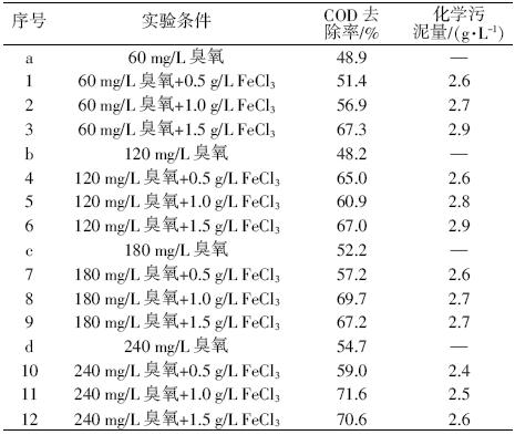 綜合藥劑投加量和COD去除效果,先混凝后臭氧氧化的較優條件為三氯化鐵投加量1.0 g/L、臭氧投加量60 mg/L,此時COD去除率為63.8%。