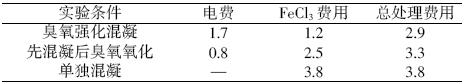 (1)臭氧發生器采用氧氣源。1 kg O3的用電量為16 kW·h,按照電費價格0.7元/(kW·h)、FeCl3(按六水三氯化鐵計)價格2 500元/t計算,可得3種方法的噸水處理費用,見表 4。