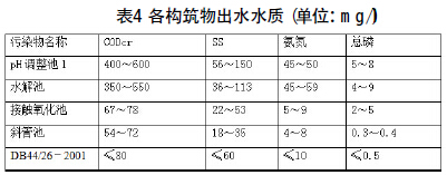 系統經過3個月的運行調試,出水水質達到廣東省《水污染物排放限值》(DB44/26-2001)第二時段一級排放標準。各構筑物出水水質處理情況見表4。