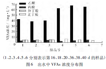 VFAs 的組成的對于厭氧水解酸化反應的效果直接相關,尤其在隨后的脫氮碳源選擇和對ANAMMOX菌的生長代謝上有較大的影響。在本實驗中,VFAs 產物主要是乙酸,丙酸,異丁酸,正丁酸(圖6)。