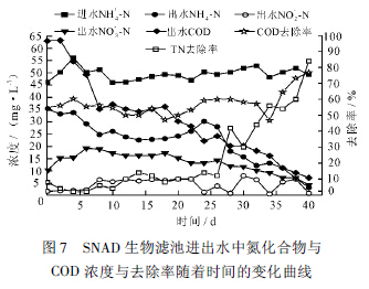 將已經掛膜的SNAD 填料投入SNAD 生物濾池,同時啟動厭氧水解酸化與SNAD 單元,形成組合工藝,并用模擬農村生活污水進行貫通實驗驗證,實驗期間為40 d。