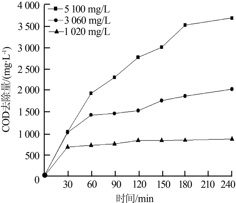 與此同時,反應過程中,發現直流電源電壓隨著初始COD的增加而減小,初始COD為5 104 mg/L時,電壓最大可達11.3 V;當初始COD為3 060 mg/L時,電壓最大值為13.5 V;初始COD為1 020 mg/L時,電壓高達28.3 V。這是因為廢水中印染助劑本身就是電解質,隨初始COD的增大,廢水本身導電性能就越好,在恒流條件下,電壓就越低,處理單位廢水能耗也就越小,同時也降低了副反應的發生幾率。此結論與陳金鑾得出的結論類似。同時,由于該印染生產廢水中摻有多種表面活性劑,在曝氣作用下反應體系表面就會產生大量的白色泡沫,此層泡沫的存在會降低平均電流效率,導致電解電壓增大,能耗增加。在試驗過程中,以廢水初始COD為1 020 mg/L為例,反應若沒有及時刮除過多泡沫,電解電壓可高達30 V。因此,綜合考慮能耗與廢水特征污染物的去除,選擇原始濃度廢水處理是最佳的選擇。