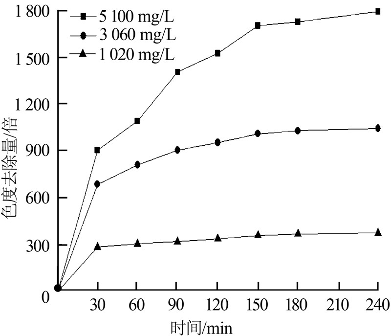 實驗用水取自四川省綿陽市某印染廠不同生產階段的混合廢水,廢水有機物濃度高、成分復雜,呈深青褐色,其中COD 5 104 mg/L,BOD5 628.75 mg/L,NH3-N 73.36 mg/L,pH=9.07,色度1 928倍,B/C= 0.12。