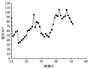 可見,在不曝氣的條件下,該BES 的10 Ω電阻兩端最大電壓為106 mV。運行初期,系統(tǒng)的電壓較小,隨著反應(yīng)器運行,測得電壓增大,但是在30 d~35 d 時,BES 的電壓明顯有所降低,此時BES 處理效果也有所降低,是由于氣溫突降影響了微生物的活性;在40 d 之后,電阻兩端電壓穩(wěn)定在80~100 mV 之間,此時BES 運行較為穩(wěn)定,且處理效果較好。表明電阻上電壓值能間接反映BES 的微生物活性和廢水處理程度。
