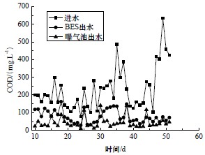 Fig.3 COD Changes of influent and effluent of the BES and the aerobic system