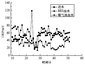 Fig.7 ORP Changes of influent and effluent of the BES and the aerobic system