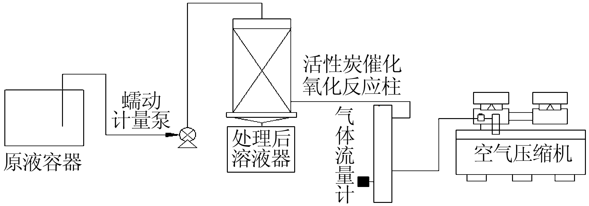 催化氧化試驗吸附柱炭層高度為520 mm。廢水從裝有活性炭的吸附柱頂部噴淋,流經(jīng)活性炭吸附柱,與柱體底部通入的空氣逆向接觸。經(jīng)吸附和空氣氧化后的廢水從柱體底部流出,空氣從柱體頂部排出。視試驗狀況適時調(diào)整進(jìn)氣量,防止液泛發(fā)生。