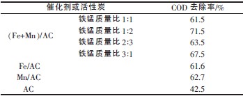 由表1 可以看出,活性炭對COD 有一定的吸附去除作用,與之相比催化劑對COD 的去除率大幅提高,說明催化作用明顯,其中以鐵錳質量比1∶2 時制備的(Fe+Mn)/AC 催化劑對印染廢水處理的效果最好。