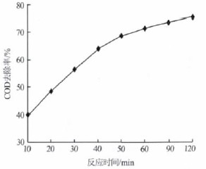 通入300 mL 印染廢水,在廢水pH=8.6、臭氧通氣量為0.2 L/min、(Fe+Mn)/AC 投加質量為20 g的條件下,分別在反應10、20、30、40、50、60、90、120 min時取樣分析并計算COD 去除率,結果見圖2。