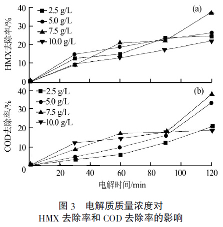 從圖3可以看出,在不同電解質質量濃度下,HMX去除率和COD去除率隨時間的變化較為復雜,但整體都隨時間的增加而增大。Na2SO4質量濃度<7.5 g/L時,去除率均隨電解質的增加而增大;而Na2SO4質量濃度>7.5 g/L后,相較于低濃度電解質條件下去除率相對變低。這是因為電解質達到一定濃度時,較多的SO42-會吸附在電極表面,影響電極對廢水的直接電催化降解,導致有機物降解效率變低。Na2SO4質量濃度為7.5 g/L、電解120 min后,電極對HMX炸藥廢水的HMX去除率為37.42%,COD去除率為38.11%。因此實驗選擇Na2SO4質量濃度為7.5 g/L。