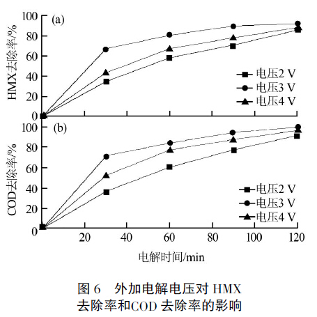 (4)外加電解電壓對HMX處理效果的影響。在Na2SO4質量濃度為7.5 g/L、溶液pH為3、反應溫度為35 ℃、極板間距為1 cm的條件下,用Ti/TiO2-SnO2-RuO2電極電催化降解HMX炸藥廢水,控制電解槽的外加電解電壓分別為2、3、4 V,考察外加電解電壓對HMX去除率和COD去除率的影響,如圖6所示。
