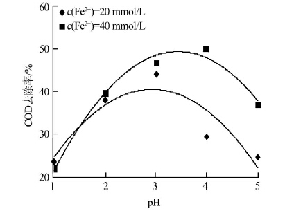 由圖 2可見,對于不同的原水pH,Fe2+<80 mmol/L時,COD去除率都隨FeSO4投加量的增大而升高;而當Fe2+>80 mmol/L時,pH為2的原水隨FeSO4投加量的增大COD去除率呈小幅下降趨勢,檢測pH發現,這時溶液的pH已接近1,偏離了Fenton試劑氧化的最佳pH范圍,這可能是COD去除率出現下降趨勢的主要原因。