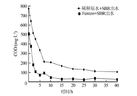 (3)Fenton氧化+SBR處理后葡萄酒廢水COD可降至40 mg/L以下,而未經Fenton預處理的稀釋廢水,SBR好氧處理40 h后COD只降至105 mg/L。