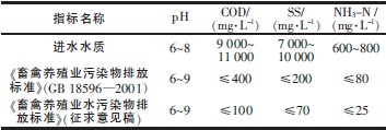 由于國家環保部正在制定新的畜禽養殖排放標準,為避免處理設施建成后不能達到新標準,因此在設計的時候參考嚴格的排放標準。在設計出水水質時,參照《畜禽養殖業水污染物排放標準》(征求意見稿)的要求。設計進出水水質如表1 所示。