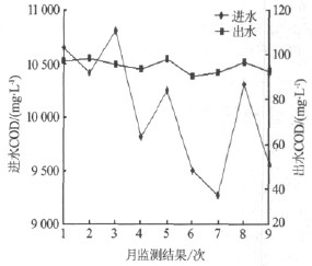 對2011 年6 月至2012 年2 月的出水COD 情況進行監測(每個月的監測結果是月初、月中、月末3 次結果的平均值),結果如圖2 所示。
