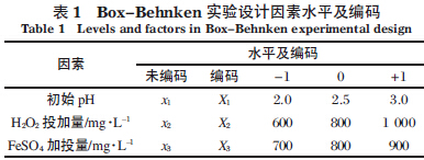 印刷油墨廢水成分復(fù)雜,色度大,有機(jī)物含量高(COD 可達(dá)20 g/L 左右,有的高達(dá)300 g/L),生物降解性很低,大多具有潛在毒性,是極難處理的工業(yè)廢水之一。直接排放會破壞水生生態(tài)環(huán)境,造成水體嚴(yán)重污染。目前我國對油墨廢水的處理方法主要有物理、化學(xué)和生物處理或者幾種處理技術(shù)組合以強(qiáng)化處理效果,以上常規(guī)的水處理方法已不能滿足處理要求。研發(fā)高效新型的油墨廢水(預(yù))處理方法和技術(shù),是此類廢水處理的難點(diǎn)之一。高級氧化技術(shù)作為一種新環(huán)境凈化技術(shù)受到越來越多的關(guān)注。其中,F(xiàn)enton氧化技術(shù)能夠有效去除廢水的COD,能使許多結(jié)構(gòu)穩(wěn)定、甚至很難被生物降解的有機(jī)物轉(zhuǎn)化為無毒無害可生物降解的低分子物質(zhì),可提高生物處理有效性和經(jīng)濟(jì)可行性,同時具有設(shè)備簡單、反應(yīng)條件溫和、高效等優(yōu)點(diǎn),在印染廢水的深度處理中有較好的應(yīng)用前景。響應(yīng)曲面法是一種綜合實驗設(shè)計和數(shù)學(xué)建模的優(yōu)化方法,是一種可靠的研究廢水處理過程的分析方法,可以有效地分析過程參數(shù)單獨(dú)的及相互作用對響應(yīng)量的影響。利用響應(yīng)曲面法對有限的實驗點(diǎn)進(jìn)行分析得到模型,可預(yù)測目標(biāo)值的具體工藝條件,能大大地減少實驗的次數(shù)和時間。本文以油墨廢水為研究對象,采用Fenton 試劑氧化降解廢水中的有機(jī)污染物,利用Box-Behnken 分析法,以廢水的COD 去除率為響應(yīng)值,對影響其降解的關(guān)鍵因素(初始pH 值、H2O2投加量及FeSO4 投加量)進(jìn)行優(yōu)化并得到最佳條件。