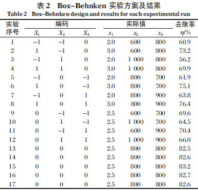 依據(jù)前期單因素的研究結(jié)果,得到明顯影響Fenton 氧化油墨廢水的因素有:初始pH 值,H2O2投加量,F(xiàn)eSO4 投加量,對3 因素及其水平進(jìn)行設(shè)計。利用Design Expert 8.0 軟件,采用Box-Behnken 設(shè)計方案,設(shè)計響應(yīng)曲面,對Fenton 氧化處理油墨廢水的COD 去除率進(jìn)行優(yōu)化,確定最優(yōu)工藝。以COD 去除率為響應(yīng)值,初始pH 值、H2O2投加量及FeSO4 投加量為自變量。其中x1,x2 和x3 分別為初始pH 值,H2O2投加量,F(xiàn)eSO4 投加量,并以-1,0,+1 代表3 因素的水平,按方程Xi=(xi-x0)/Δx 對自變量進(jìn)行編碼。其中,Xi為變量的編碼值;xi 為變量的真實值;x0 為實驗中心點(diǎn)處變量的真實值;Δx 為變量的變化步長。自變量因素編碼及水平見表1。