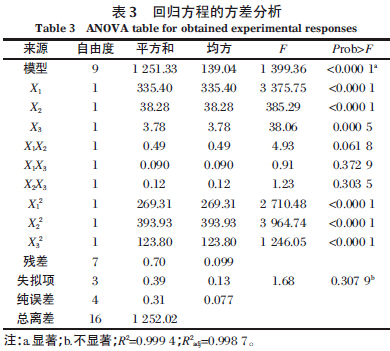 響應(yīng)曲面法設(shè)計實驗,利用統(tǒng)計軟件Design Expert8.0 中的ANOVA(analysis of variance,方差分析)進(jìn)行分析。結(jié)果列于表2。
