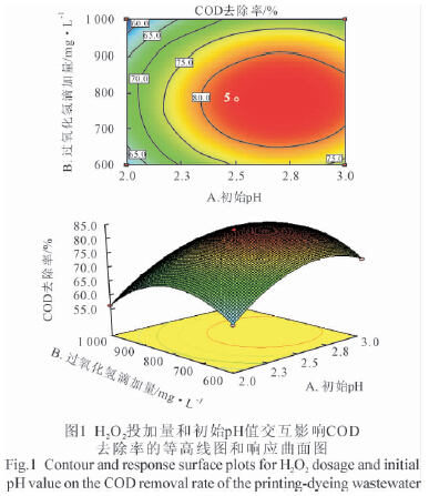 (2)Fenton 氧化處理油墨廢水的3 個參數(shù)對COD去除率的影響兩兩之間有一定的交互作用,其中初始pH 值,H2O2投加量,F(xiàn)eSO4 投加量對COD 去除率的影響大小為:初始pH 值>H2O2投加量>FeSO4 投加量。