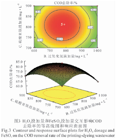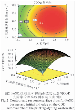圖1 顯示了H2O2投加量和初始pH 值對COD 去除率的影響。由響應(yīng)曲面圖可以明顯得出,COD 去除率隨初始pH 值和H2O2投加量的增大,先增大到一定程度后開始降低,而在H2O2投加量362~972 mg/L,初始pH 值2.35~3.00 的不規(guī)則區(qū)域,COD 的去除率均在80.0%以上;其中COD 去除率對初始pH 的變化比對H2O2投加量的變化更為敏感。圖2 顯示了FeSO4投加量和初始pH 值交互影響,在FeSO4 投加量717~888 mg/L,初始pH 值2.35~3.00 的不規(guī)則區(qū)域,COD的去除率均在80.0%以上;其中COD 去除率對初始pH的變化比對FeSO4投加量的變化更為敏感。圖 3顯示了H2O2投加量和FeSO4 投加量交互作用對COD去除率的影響,在H2O2投加量362~972 mg/L,F(xiàn)eSO4投加量717~888 mg/L,COD 的去除率均在80.0%以上;其中COD 去除率對H2O2投加量的變化比對FeSO4投加量的變化更為敏感。因此初始pH 值、H2O2投加量,F(xiàn)eSO4 投加量對COD 去除率的影響大小為:初始pH 值>H2O2投加量>FeSO4 投加量。