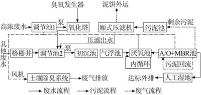 針對本項目廢水特點,再經過了一系列的實驗后,從處理效果和處理成本等方面綜合考慮,決定采用臭氧高級氧化技術作為高濃廢水的預處理工藝,綜合廢水采用物化+厭氧+MBR+人工濕地的處理工藝,工藝流程見圖 1。