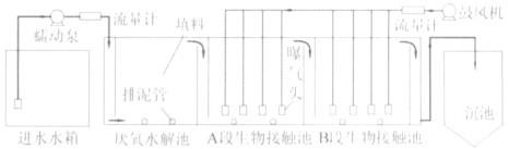系統采用空壓機供氣,曝氣砂頭曝氣,曝氣量由玻璃轉子流量計控制。反應器通過蠕動泵從厭氧端進水,經降解處理后,由好氧端出水。水解池和A 段接觸氧化池內填料為美國某公司生產生物帶,B 段接觸氧化池內填料為湖北某公司生產的蜂窩填料。