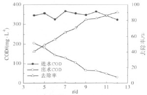 圖2 表明,系統掛膜第4 天,COD 去除率已達到40.54%;第10 天COD 去除率達到82.44%>80%,并且厭氧段和好氧段填料上均出現厚厚的生物膜。用光學顯微鏡觀察接觸氧化池填料上生物膜,發現上面有大量的細菌、真菌、原生動物和后生動物,它們構成了一個穩定的微生態系統。此時即為認掛膜成功。