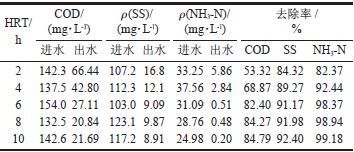 由表2 可知,污染物的去除率隨HRT 的延長而增加,但從COD 的組成看,其去除率并不能無限增大,當HRT>6 h 時,基質降解速率減慢,直至不再增加,微生物的增長達到飽和,系統對污染物的去除率達到最大。COD 和NH3-N 的去除率變化有相同的趨勢,而SS 的去除率變化較小,分析原因:在水解反應池內,填料表面大量微生物將污水中大的顆粒物質和膠體物質截留和吸附,這是一個快速的物理過程,在十幾秒鐘或幾十秒鐘內就可以快速完成,在厭氧菌的作用下,將這些大顆粒難降解物質分解為小分子易降解的物質[8-9]。大部分的懸浮物在水解段得以去除,所以HRT 對SS 去除率影響不大。