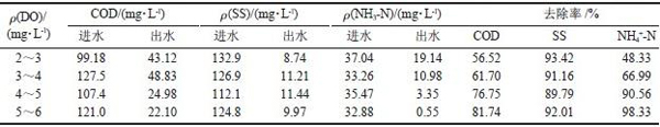 由表3 可知,污染物的去除率隨著DO 含量增加呈上升趨勢。COD、SS、氨氮的去除率在原來的基礎上都有一定程度的提升。但SS 的去除率受DO 含量影響不大。而且當鼓風量增大到一定程度時,由于氣泡的沖刷作用,出水中會含有大量脫落的生物膜,并且大量的鼓風會提高工藝運行成本,因此,氧化池內DO 的質量濃度維持在5~6 mg/L 為宜。
