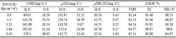 由表4 可知,隨著容積負荷的提高,COD 的去除率呈上升趨勢,當容積負荷由0.9 kg/(m3·d)逐漸增加到3.45 kg/(m3·d)時,COD 去除率由81.34%逐漸增加到87.11%,表明系統有很強的抗沖擊負荷能力和穩定性。而SS、NH3-N 的去除率則是先上升后下降。當進水容積負荷為3.45 kg/(m3·d)時,NH3-N 的去除率降到94.97%,出水NH3-N 的質量濃度達到1.63mg/L。分析原因:當進水有機物含量很高時,生物膜中的異養好氧菌種群生長占優勢,從而抑制了硝化和反硝化菌的生長,導致氨氮去除率有所降低,同時影響出水SS 含量。