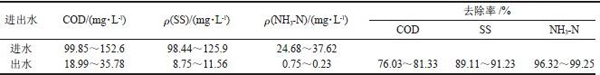 厭氧水解- 二段生物接觸氧化工藝優化運行工況為:HRT 為6 h,DO 的質量濃度為5~6 mg/L。在此工況下運行,系統對污染物有很高的去除率:COD、SS、NH3-N 去除率分別為80%、90%、99%左右。出水水質均能達到GB 18918-2002 一級A 要求。