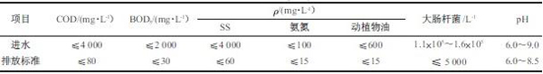 廢水產(chǎn)生有明顯的不連續(xù)性,每個季節(jié)以及每天的不同時段都不相同,節(jié)假日產(chǎn)生量較大,廢水中含有大量的血污、豬毛、骨屑、肉屑、內(nèi)臟、腸容物以及糞便等污染物,固體懸浮物含量較高,有機物濃度高,油脂含量大,廢水呈紅褐色并有腥臭味,屬于較典型的有機污水 ,可生化性好。廢水處理設計最大進水量為6 000 m3/d,平均水量為250 m3/h。處理后達到肉類加工工業(yè)水污染物排放標準(GB 13457-92)中畜類屠宰加工一級排放標準。具體進水水質(zhì)及排放標準如表1 所示。